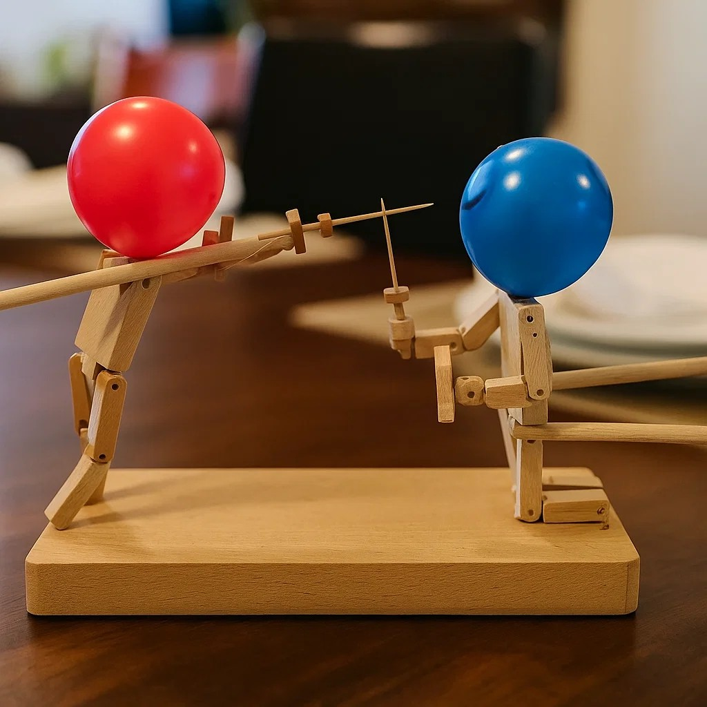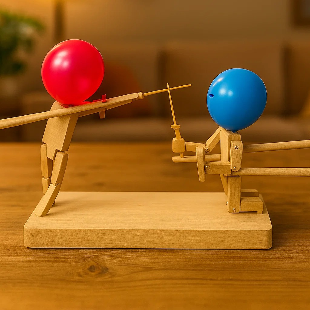 Balloon Battle Wooden Sword Game – 2-Player Bamboo Robot Puppet Toy for Kids & Parties