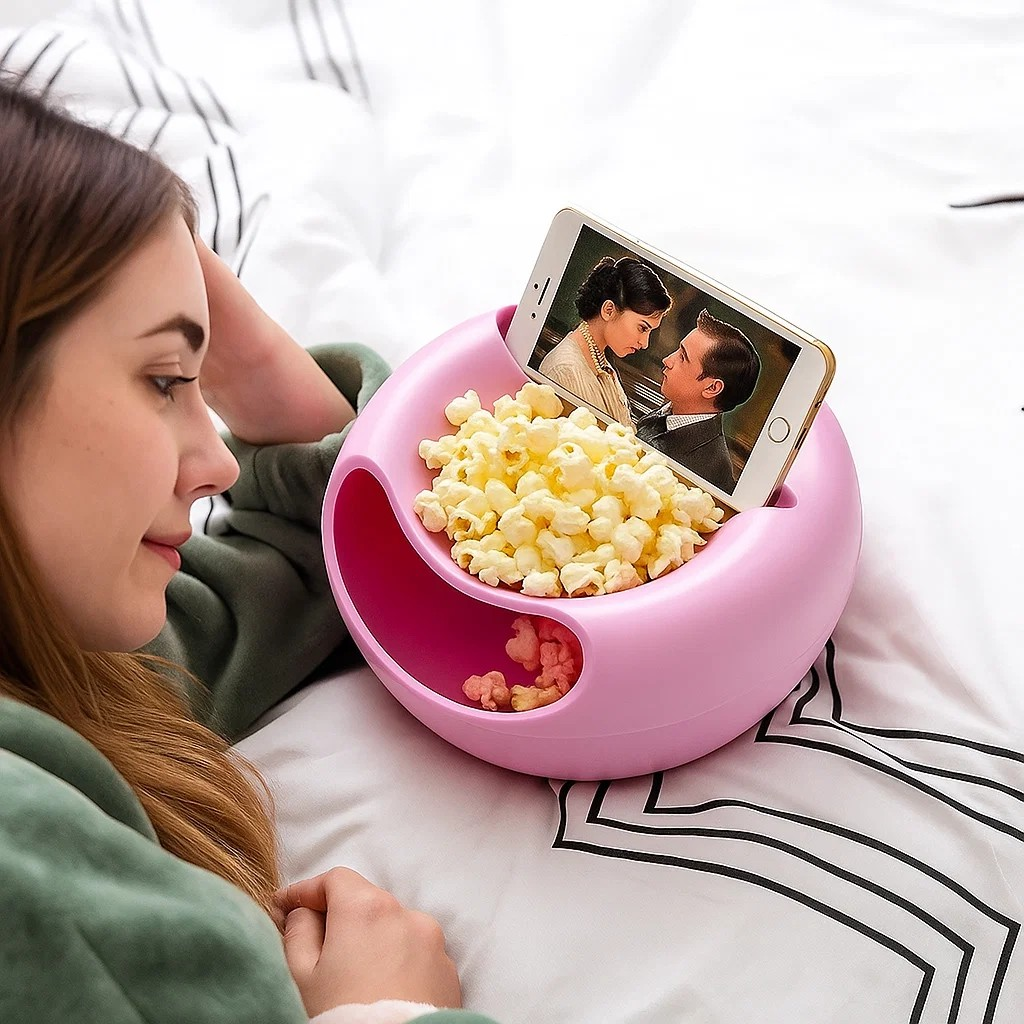Snack smarter with this multi-purpose dual-layer snack bowl, designed with a built-in phone holder for hands-free convenience! Perfect for watching... Read more
